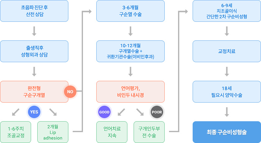 구순구개열이란 출생확률이 1/250 – 1/500로 두개안면선천기형 중 가장 흔한 질환입니다. 구순구개열환아는 윗입술과 코-치조골-경구개-연구개로 연결되는 구조에 개열이 존재하며, 그정도에 따라 완전형 및 불완전형으로 나뉘게 됩니다. 구순열을 동반하는 아이는 보통 산전 초음파로 진단이 되지만, 구개열 단독으로만 있는 경우는 산전초음파로 진단이 되지 않는 경우도 많습니다. 구순구개열 환아는 동반기형이 있는 경우들이 있으므로, 통상적으로 소아과 및 재활의학과와 연계하여 진료를 진행합니다. 그리고 출산 후 구개열이 있는 아이들은 구강 내 음압을 만드는 능력이 부족해 수유에 문제가 있으므로, 출산 후 빠른 시일 내에 성형외과 외래로 방문하시면 자세히 설명해드리겠습니다.
